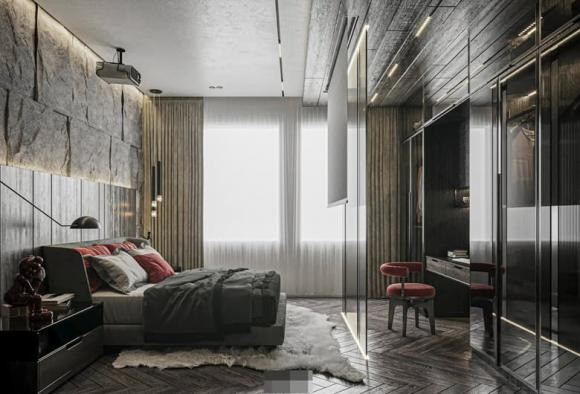 Phòng ngủ của Hà Anh rộng rãi với sàn gỗ xám thanh lịch. Tông màu xám chủ đạo tạo cảm giác dịu dàng, thư giãn, mang đến không gian nghỉ ngơi yên bình.