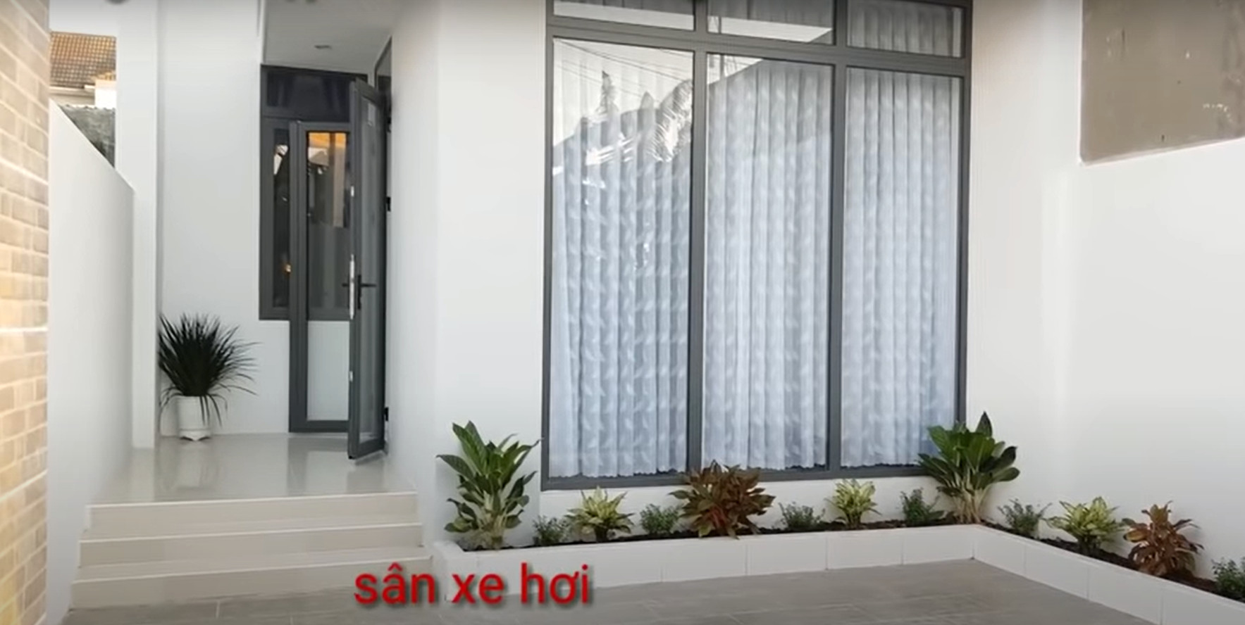Ngôi nhà mang phong cách hiện đại, nổi bật với tông màu trắng làm chủ đạo. Việc sử dụng cửa kính lớn không chỉ giúp không gian bên trong luôn sáng sủa, thoáng đãng mà còn tạo nên điểm nhấn kiến trúc ấn tượng, mang đến vẻ đẹp sang trọng và hiện đại. Sân trước rộng rãi đủ để đậu xe ô tô và một vài xe máy, đáp ứng nhu cầu di chuyển của gia đình.